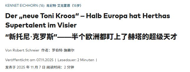在2017年,9岁的艾希霍恩加盟柏林赫塔青训,随后一直潜心深造;今年夏天刚满16岁,柏林赫塔俱乐部迅即与其签下了第一份职业合同。而艾希霍恩在过去的这几个月是急速成长,成为万众瞩目的新星。