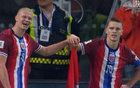 双子星挪威11-1狂胜,哈兰德与厄德高一起扶角旗竿庆祝 -